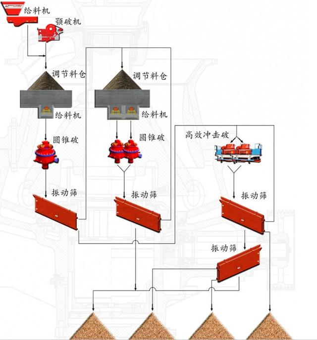 圓錐式破碎機(中碎),三破:單缸液壓圓錐式破碎機(細碎),顆粒整形采用高效
