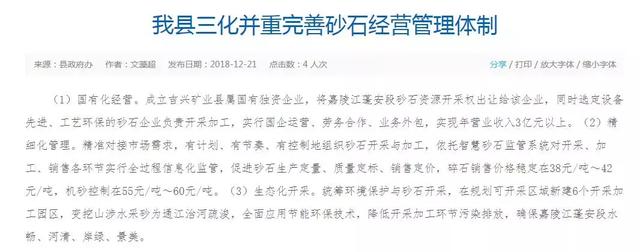 礦業縣屬國有獨資企業,將嘉陵江蓬安段砂石資源開采權出讓給該企業,同時選定設備先進、工藝環保的砂石企業負責開采加工,實行國企運營、勞務合作、業務外包,實現年營業收入3億元以上。
