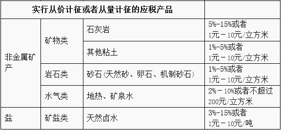 草案所附《資源稅稅目稅率表》規定了164個稅目,稅目稅率表規定了固定和幅度兩種稅率。根據稅目稅率表,可以選擇實行從價計征或者從量計征的有地熱、石灰巖、其他粘土、