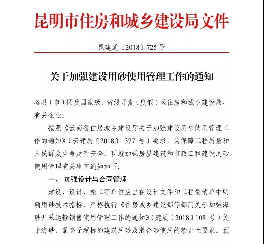 日前,云南省發布《關于加強建設用砂使用管理工作的通知》,要求建設、設計、施工等單位明確用砂技術指標,嚴格執行海砂、氯離子超標的建筑用砂及混合砂使用的禁止性要求。