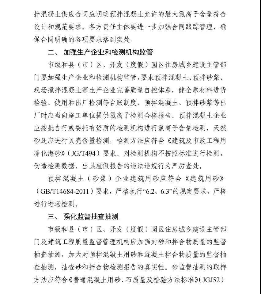 嚴格執行《住房城鄉建設部等部門關于加強海砂開采運輸銷售使用管理工作的通知》,商混供應合同應明確允許的最大氯離子含量;