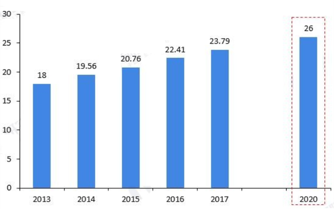 圖2 2013-2017年和2020年中國建筑垃圾的產(chǎn)量情況及預(yù)測(億噸)
