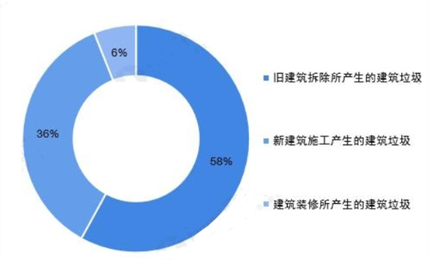 建筑垃圾的來源主要有三個方面:舊建筑拆除產(chǎn)生、新建筑施工產(chǎn)生以及建筑裝修產(chǎn)生。從2017年我國建筑垃圾的構(gòu)成分布來看,舊建筑拆除所產(chǎn)生的建筑垃圾占建筑垃圾的58%,新建筑施工產(chǎn)生的建筑垃圾占36%。由此可見,建筑物的拆除階段和新建筑的施工階段是建筑垃圾的控制關(guān)鍵點。