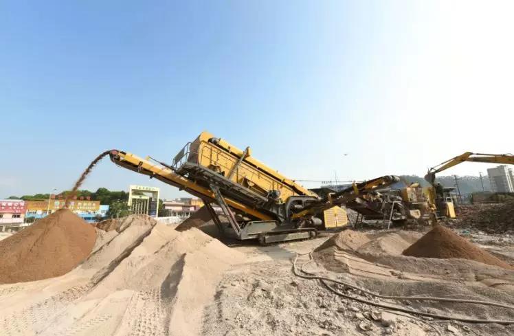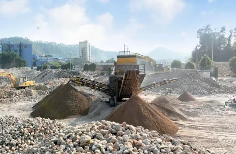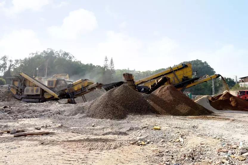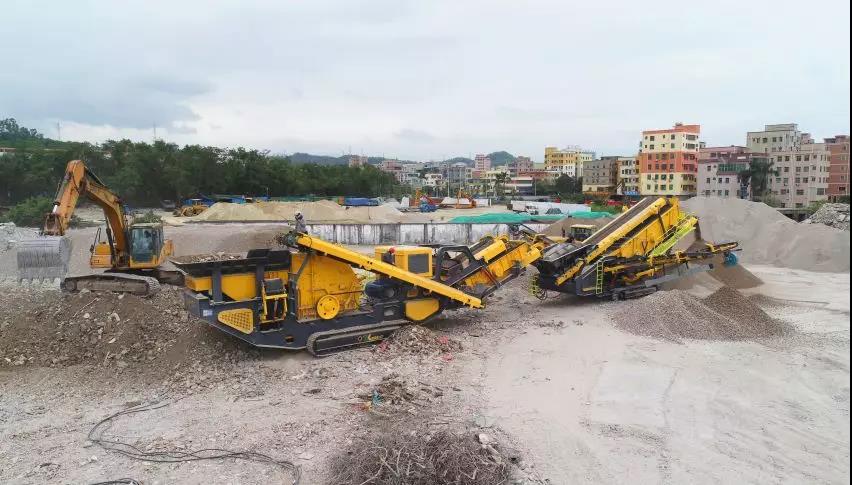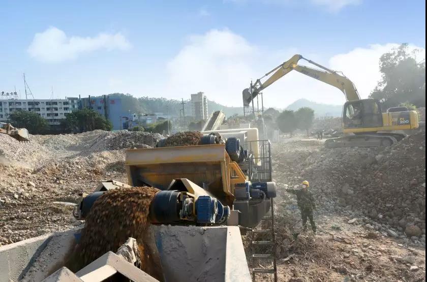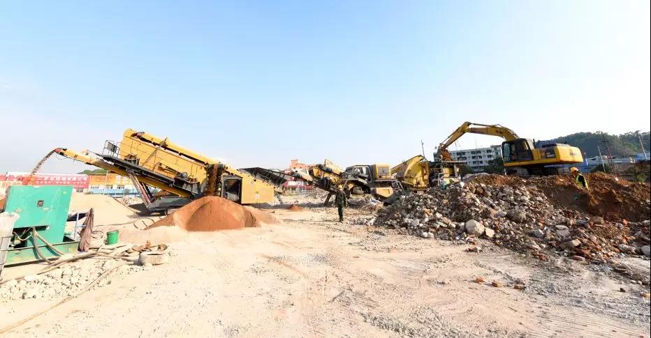 破碎篩分站正在工作,建筑垃圾在建筑物拆除工地現(xiàn)場(chǎng),被處理成