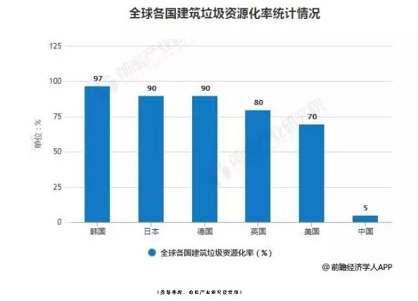 近年來,我國建筑產(chǎn)業(yè)正處于快速發(fā)展時(shí)期,建筑垃圾資源化推進(jìn)嚴(yán)重滯后,目前資源化利用率不足5%,遠(yuǎn)遠(yuǎn)低于歐盟(90%)、日本(97%)和韓國(97%)等發(fā)達(dá)國家和地區(qū)。