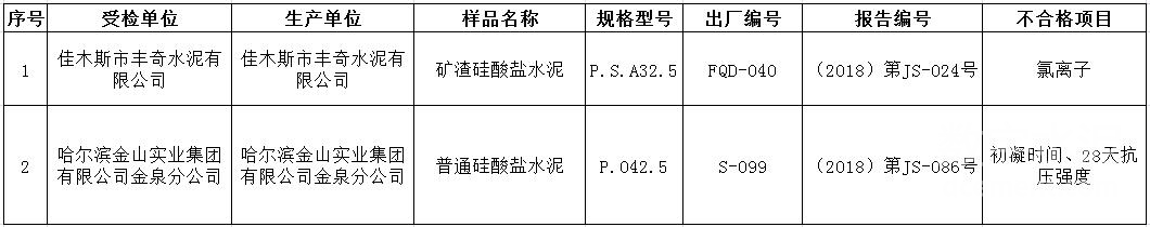 礦渣硅酸鹽水泥(強度32.5,A型)等4種通用水泥產品。通過檢驗,佳木斯市豐奇水泥有限公司生產的礦渣硅酸鹽水泥的氯離子和哈爾濱金山實業集團有限公司金泉分公司生產的普通硅酸鹽水泥的初凝時間、28天抗壓強度等指標,分別超出國家標準GB 175-2007《通用硅酸鹽水泥》中技術要求,判定為不合格(上述不合格產品具體情況詳見質檢報告)。