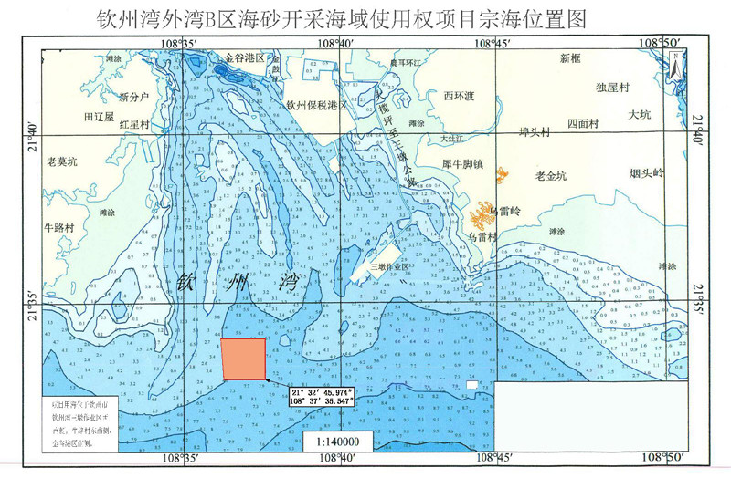 廣西欽州市擬在欽州灣口—欽州港保稅港區南西側、防城港企沙東港區東側,距離欽州保稅港區約8.0海里海域,以招拍掛方式出讓欽州灣外灣B區海砂開采海域使用權。