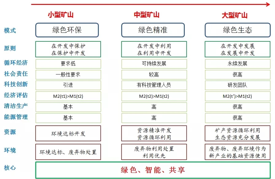 “綠色、智慧、共享”是綠色礦山的最基本要求,綠色體現出科學有序的開采過程要對礦區及周邊環境的擾動可控;智慧是采用現代技術和自動化裝備提高生產率和經濟效益,將礦山生產維持在最佳狀態和最優水平;共享是通過將資源、人才、技術、資訊、收益等與股東、職工、社區分級共享做到社會和諧。綠色環保型礦山、綠色精準型礦山、綠色生態型礦山都是綠色礦山的不同模式,適合于不同礦井類型和區域環境。