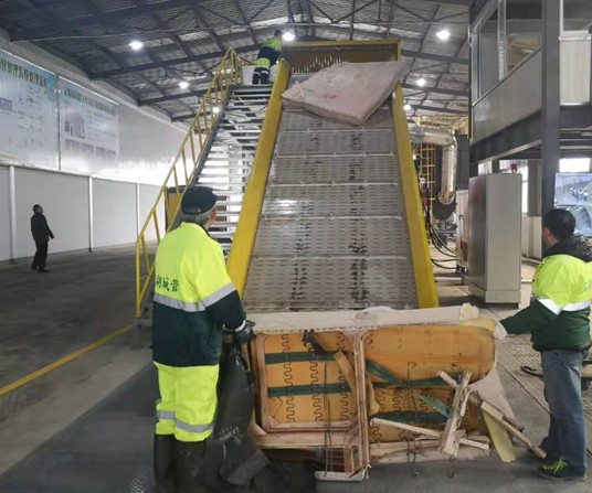 粉碎打磨過(guò)程中,設(shè)備實(shí)現(xiàn)自動(dòng)化運(yùn)行,專設(shè)的磁鐵裝置能夠?qū)⑷斯し謷醇皶r(shí)剔除的金屬回收,其余的進(jìn)行粉碎打磨,設(shè)備自帶的觸摸屏還可以隨時(shí)隨地在線監(jiān)控設(shè)備運(yùn)行情況。最后,大件垃圾分揀、粉碎產(chǎn)生的垃圾中,金屬、針織物、塑料和木料將分別進(jìn)入各自的回收利用渠道,其中金屬將重新進(jìn)行冶煉再利用,針織物將加工成為再生棉,木材、塑料加工成為再生木材和塑料,粉碎打磨后的物料則進(jìn)入垃圾焚燒廠成為燃料,實(shí)現(xiàn)大件垃圾“變廢為寶”。在設(shè)備運(yùn)行過(guò)程中,為了防止揚(yáng)塵,還專門(mén)增加了除塵噴霧系統(tǒng),最大程度的減少了揚(yáng)塵現(xiàn)象。