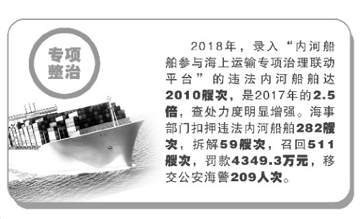 據了解,2018年,錄入“內河船舶參與海上運輸專項治理聯動平臺”的違法內河船舶達2010艘次,是2017年的2.5倍,查處力度明顯增強。海事部門扣押違法內河船舶282艘次,拆解59艘次,召回511艘次,罰款4349.3萬元,移交公安海警209人次。