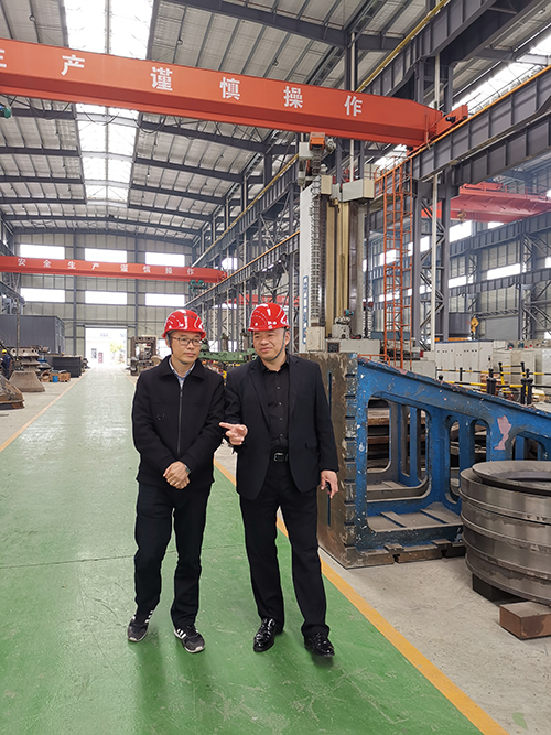 中國鐵建特種裝備事業(yè)部副總經(jīng)理、綠色建材裝備研究設(shè)計院院長王金鋒與海興機(jī)械王總經(jīng)理交談
