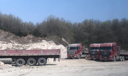 砂石中轉場看到,有多輛大貨車正在中轉場排隊等待裝載河砂。