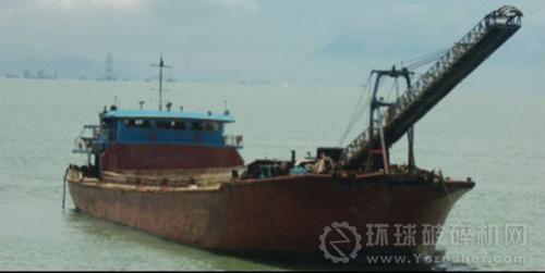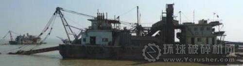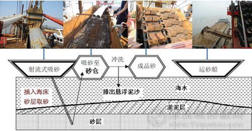 采礦生產流程:采砂船到達采砂區域后,將集砂機和提升管接好并逐步放到海底,提升管上端置于采砂船上,集砂機將砂收集到一起后,利用射流對砂進行沖洗,將大部分黏著沉積物沖洗掉,防止提升管道堵塞。提升管用一組連接管組成,通過提升管道把砂漿從海底集砂機系統傳送到海面的采砂平臺。從管道上提升上的砂漿到達采砂平臺后進行脫水處理,最大限度的減小海砂的體積重量比,便于運輸。經分離后的殘留物通過排污軟管排入海中。海砂暫存在采砂平臺(船)上,然后轉送到海砂運輸船上,再運輸到指定地點。