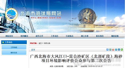 近日,廣西北海市海洋局發布《廣西北海市大風江口-雷公沙礦區(北部礦段)海砂