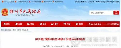 今天,贛州政府發布《關于贛江贛州段全線禁止河道采砂的通告》,要求,2019年5月1日起,贛江贛州段全線禁采河道砂石。