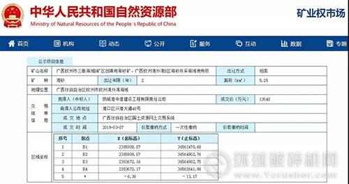 據了解,2019年3月8日,廣西欽州市三墩海域B礦區回填用海砂礦、廣西欽州灣外灣B區海砂開采海域使用權聯合網上拍賣出讓結果公示,成交價:13540萬元,其中,采礦權成交價5308.9209萬元,海域使用權成交價8231.0791萬元。