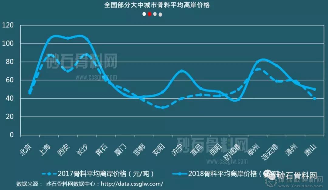 2018年,各大中城市骨料平均離岸價格仍穩中有升。其中全年平均漲幅靠前的分別為濟寧、安陽和西安,單位上漲幅度分別為30元、17元和36元,漲幅比例均大于50%,而漲幅稍低的連云港、唐山、上海和長沙四地骨料離岸價格也出現了10-20元不等的漲幅。