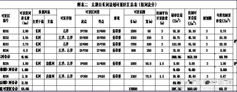 太湖縣長河山區支流安樂河、店前(后鋪)河、南陽河,冶溪(前鋪)河6個可采區經探測儲砂總量為297.35萬m?,規劃期為3年(2019~2021年),控制可采總量180.5萬m?,平均年控制開采總量為60.17萬m。