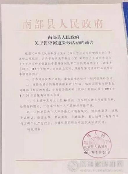 3月20日,縣人民政府印發《關于暫停河道采砂活動》通告: