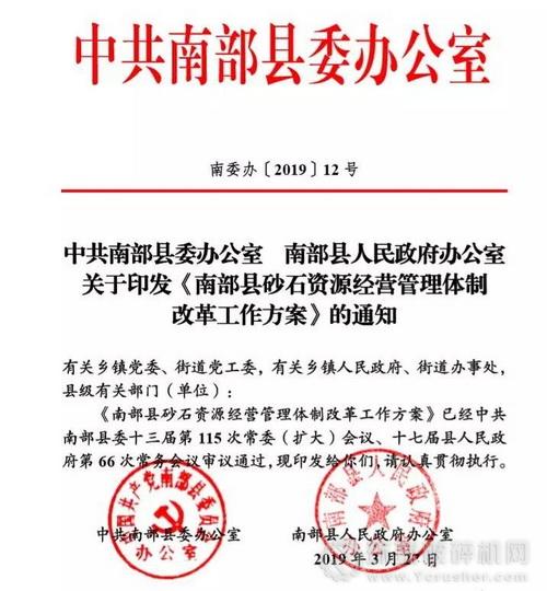 3月27日,中共南部縣委辦公室印發《南部縣砂石資源經營管理體制改革工作方案》等通告。