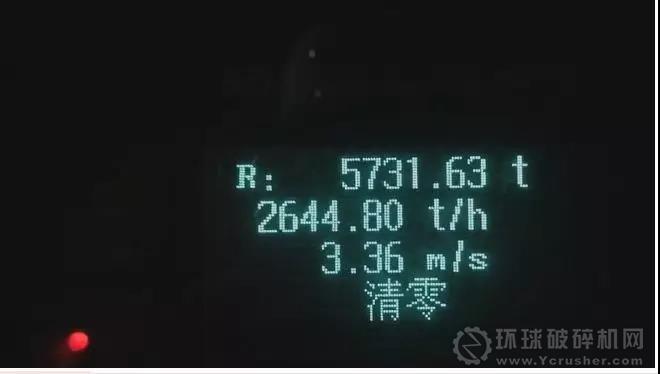 粗碎車間和2套平硐溜井系統。毛料通過溜井落入待料區,通過B2500型重板式給料機均勻給料至鑫金山JSPCD2426(加強型)破碎主機內。經過現場儀表檢測,在飽和給料的情況下,主機瞬時產量峰值達2648噸/小時,經過3小時的綜合檢測,平均產量可達2600噸/小時,電流始終穩定在25安左右。折合噸破碎電耗僅0.1度。