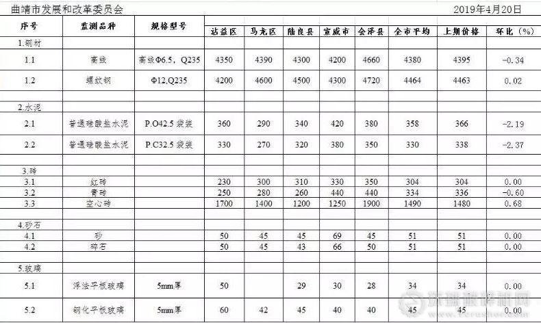 曲靖市建材價格專項監測月報表(2019)