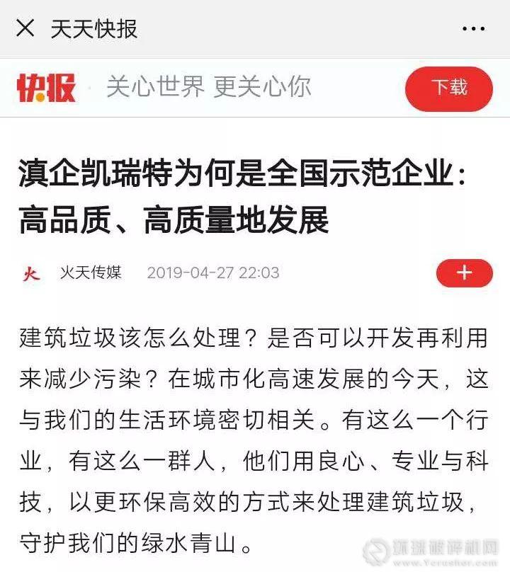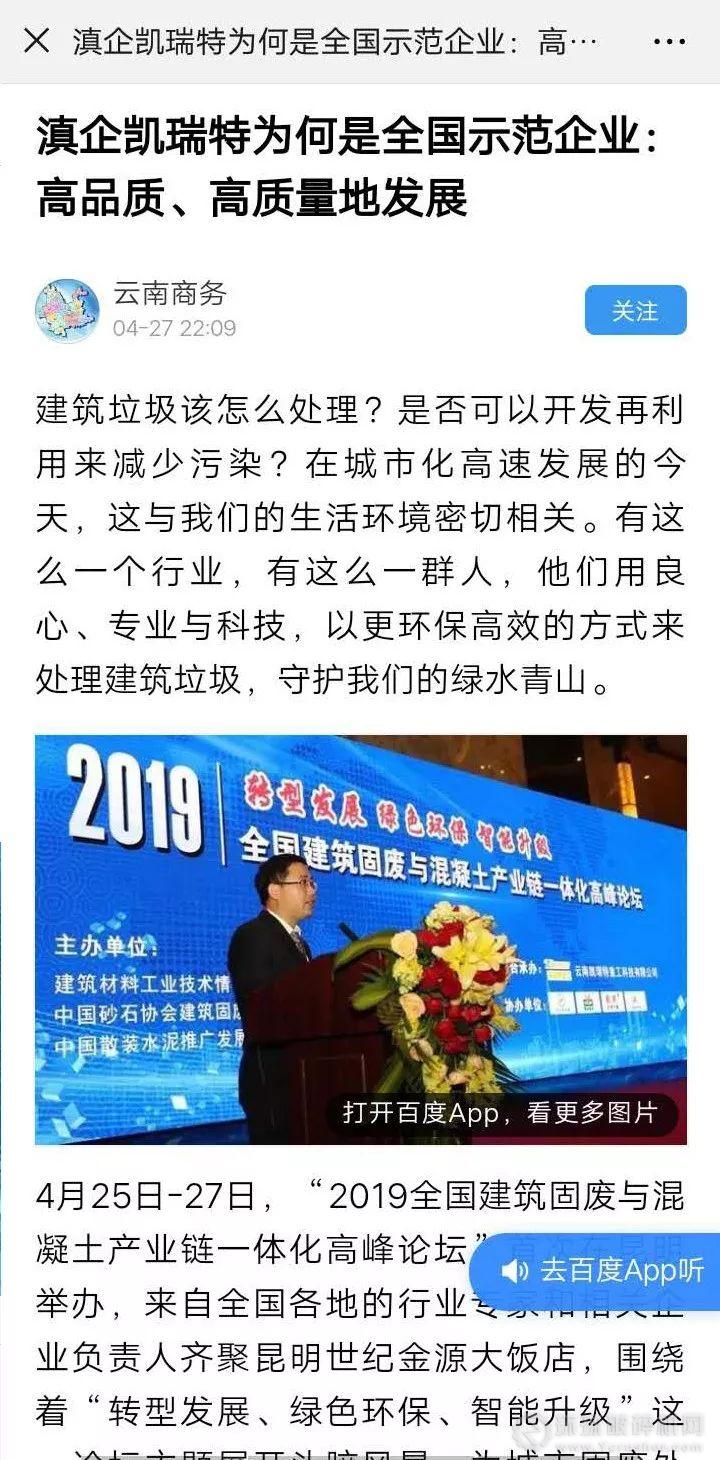 隨著“2019全國建筑固廢與混凝土產(chǎn)業(yè)鏈一體化高峰論壇”在云南昆明的召開,凱瑞特重工入選全國混凝土行業(yè)產(chǎn)業(yè)鏈一體化全國示范企業(yè),各大媒體爭相報道。