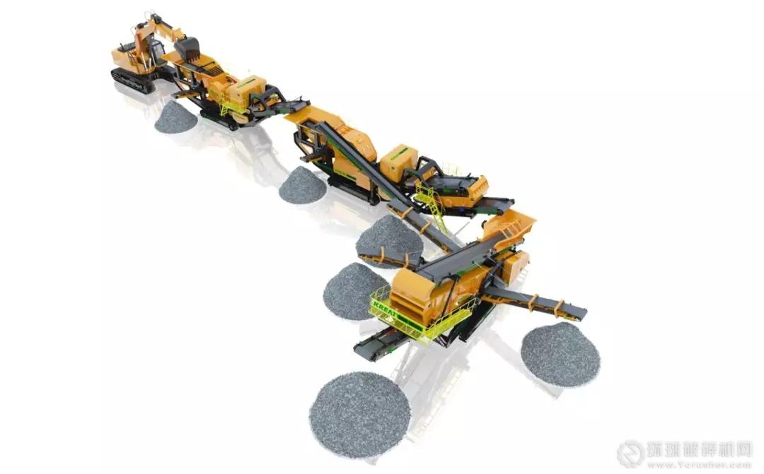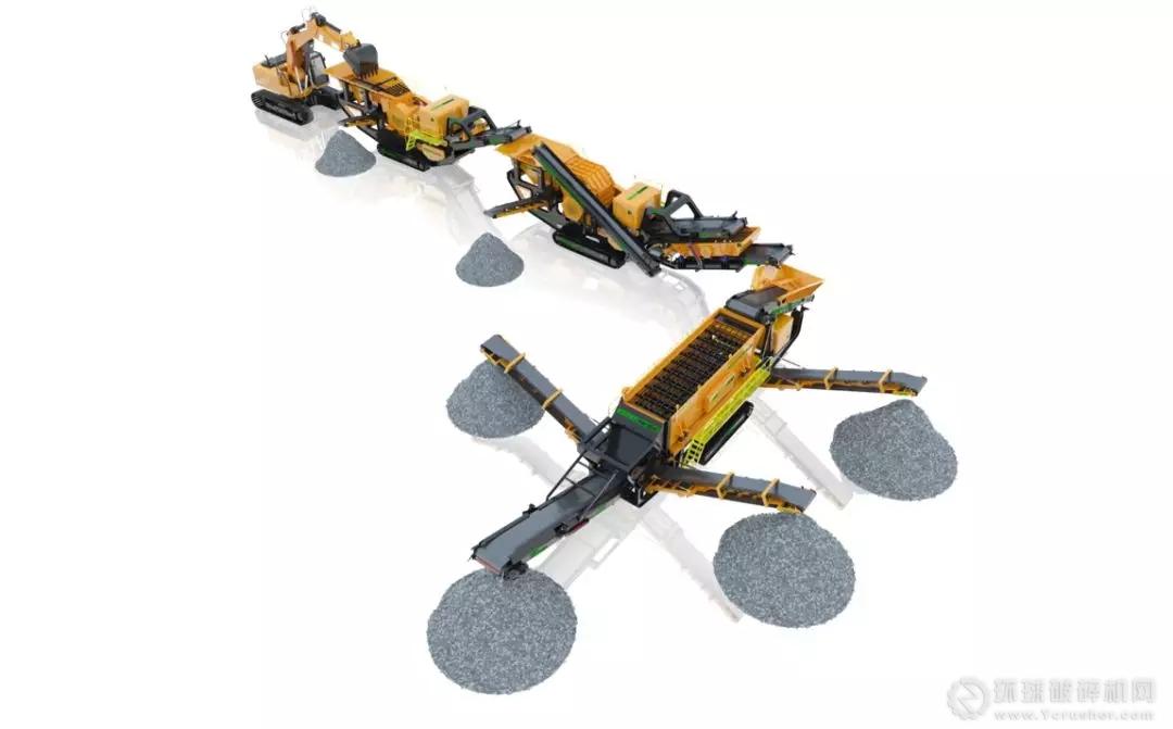 履帶移動顎式破碎站+履帶移動錘式破碎站+履帶移動水平篩分站