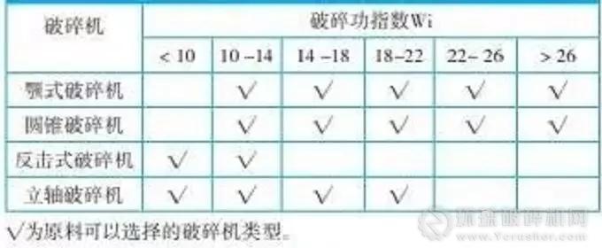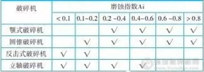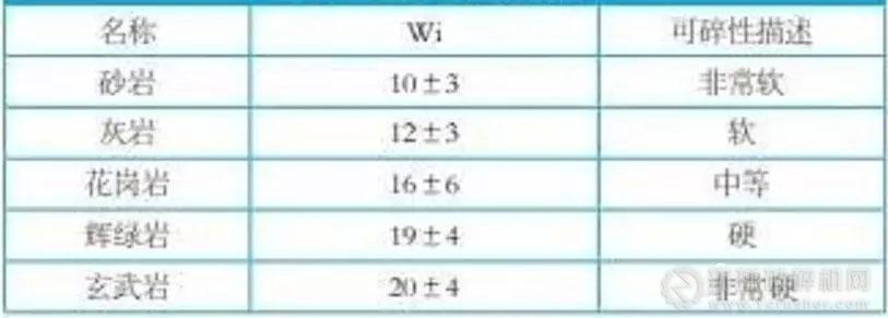Wi:破碎功指數(shù)——物料破碎的難易程度,Ai:磨蝕指數(shù)——物料對機件的磨損程度,常見礦石的Wi和Ai見表1、表2。破碎設(shè)備對原料的適應(yīng)范圍見表3、表4。