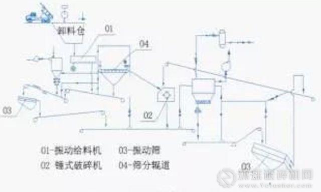 破碎系統(tǒng)典型的流程有:單段錘式破碎機系統(tǒng)、