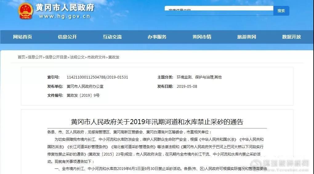 日前,黃岡市人民政府發布2019年汛期河道和水庫禁止采砂通告,在汛期內全市境內長江干流、中小河流和水庫內禁止采砂活動。