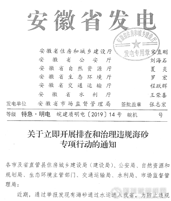 近期發現有海砂通過水運進入安徽省,為防止違規海砂用于建設工程,防范建筑工程質量事故發生,切實保障人民群眾生命財產安全,安徽省住房和城鄉建設廳、公安廳、自然資源廳、生態環境廳、交通運輸廳、水利廳、市場監督管理局決定在全省范圍內開展排查和治理違規海砂專項行動。
