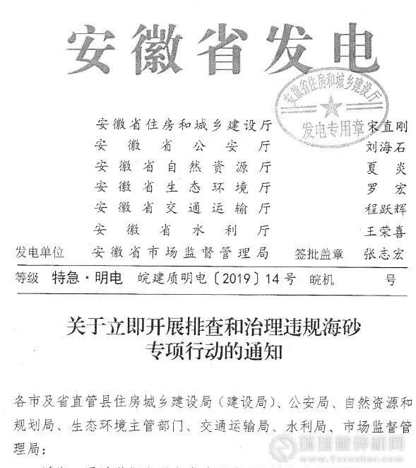 近期發現有海砂通過水運進入安徽省,為防止違規海砂用于建設工程,防范建筑工程質量事故發生,安徽省住房和城鄉建設廳、公安廳、自然資源廳、生態環境廳、交通運輸廳、水利廳、市場監督管理局決定在全省范圍內開展排查和治理違規海砂專項行動。