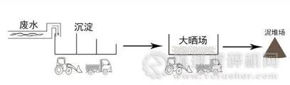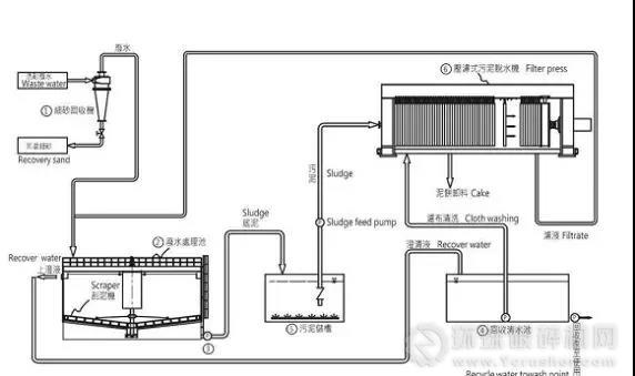 洗砂機→細砂回收機一臺(進行0.075以上的顆粒回收)→廢水中轉水池(中轉以方便小部份細砂沉淀,可用可不用)→廢水處理系統(進行變量加藥沉淀、清水回收、淤泥濃縮)→板框壓濾機(淤泥干化),如下圖所示: