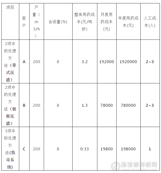 洗砂用藥成本高(3-9元/噸)、需要多名技術人員、不能實時監測調整藥量配比容易造成藥劑對砂體二次污染(帶式壓濾機重復用藥,成本加重,泥餅含水率高.板框壓濾機生產時間過長導致處理量降低)
