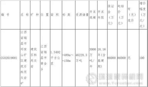 日前,自然資源部網站轉發瑞昌市礦產資源儲備交易中心發布的《瑞昌市礦業權出讓網上掛牌公告》,顯示,江西省瑞昌市鄧家山礦區建筑石料用灰巖礦業權正在掛牌出讓,開采規模3000萬噸每年,開采年限為18.16年(含基建期),起始價8.6億元。