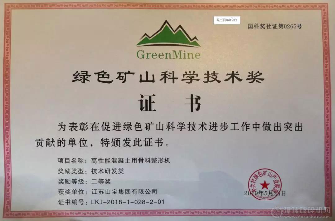 為貫徹落實國家六部委《關(guān)于加快建設(shè)綠色礦山的實施意見》和九個行業(yè)國家綠色礦山建設(shè)規(guī)范的發(fā)布和實施,推動我國綠色礦業(yè)發(fā)展及轉(zhuǎn)型升級,提高礦產(chǎn)資源節(jié)約和綜合利用水平,2019年綠色礦業(yè)發(fā)展大會于5月23日-5月25日召開。江蘇山寶集團(tuán)——高性能混凝土用骨料整形機(jī)(V8X系列)獲綠色礦山科學(xué)技術(shù)獎,技術(shù)研發(fā)類“二等獎”。