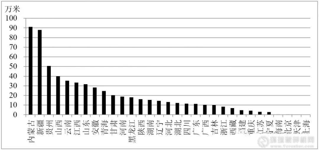 項目4860項次,同比減少24.3%。其中,新開1912項次,續作2948項次。完成鉆探工作量625萬米,同比減少9.9%。完成鉆探工作量排名前5位的省份分別是:內蒙古(91.16萬米)、新疆(88.00萬米)、貴州(50.45萬米)、山西(40.01萬米)、云南(35.31萬米)。