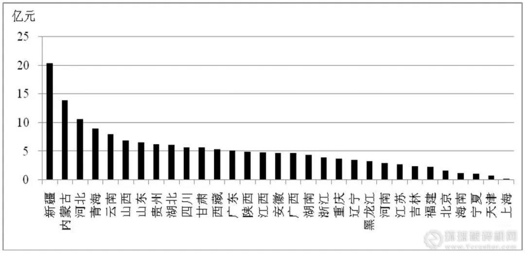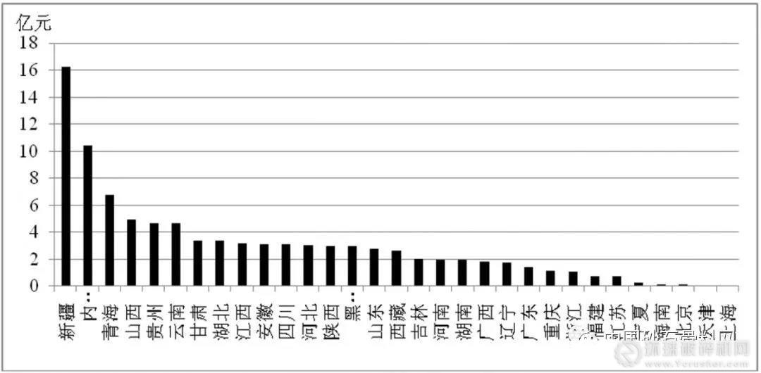 資金投入排名前5位的省份分別是:新疆(16.23億元)、內蒙古(10.38億元)、青海(6.71億元)、山西(4.93億元)、貴州(4.65億元)。