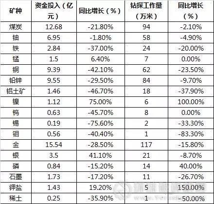 資金投向:以金(15.54億元)、煤炭(12.68億元)、鉛鋅(9.55億元)、銅(9.39億元)、鈾(6.95)為主,占礦產勘查總投入的58.3%。與2017年相比,鎳、銀、鉀鹽、錳投入分別增加75%、41.1%、19.2%、6.4%,錫、鋁土礦、鎢、銅、鉬、鐵等礦種投入降幅較大。
