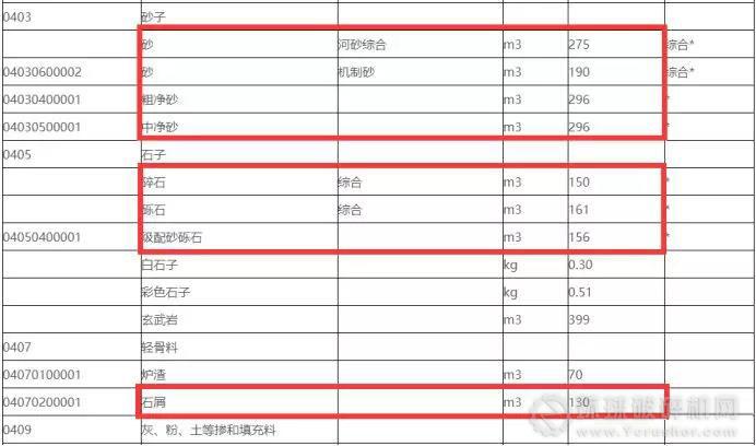 通知顯示,河砂綜合價格為275元/方,機制砂190元/方,中、粗凈砂296元/方。碎石綜合價格為150元/方,礫石綜合價格為161元/方。