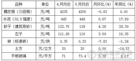 5月份,山東省濟寧市7種黃河灘遷建物資價格整體保持穩中偏強運行。其中,螺紋鋼和水泥(32.5強度)的價格基本與上月上月持平,砂、石和平板玻璃的價格上漲比較明顯。
