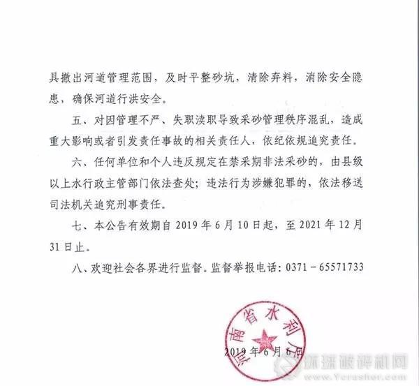 任何單位和個人違反規定在禁采期非法采砂的,由縣級以上水行政主管部門依法查處;違法行為涉嫌犯罪的依法移送司法機關追究刑事貴任。公告有效期自2019年6月10日起,至2021年12月31日止。