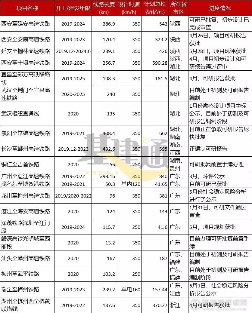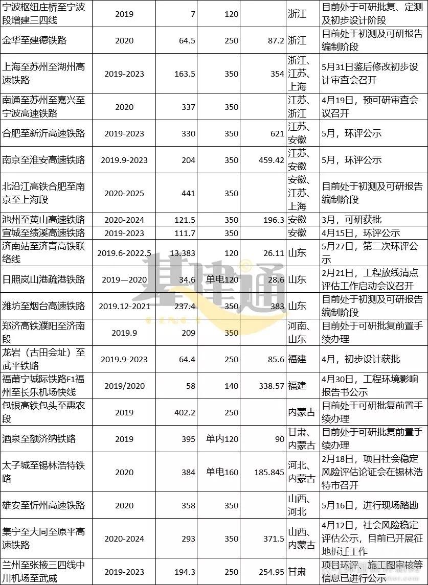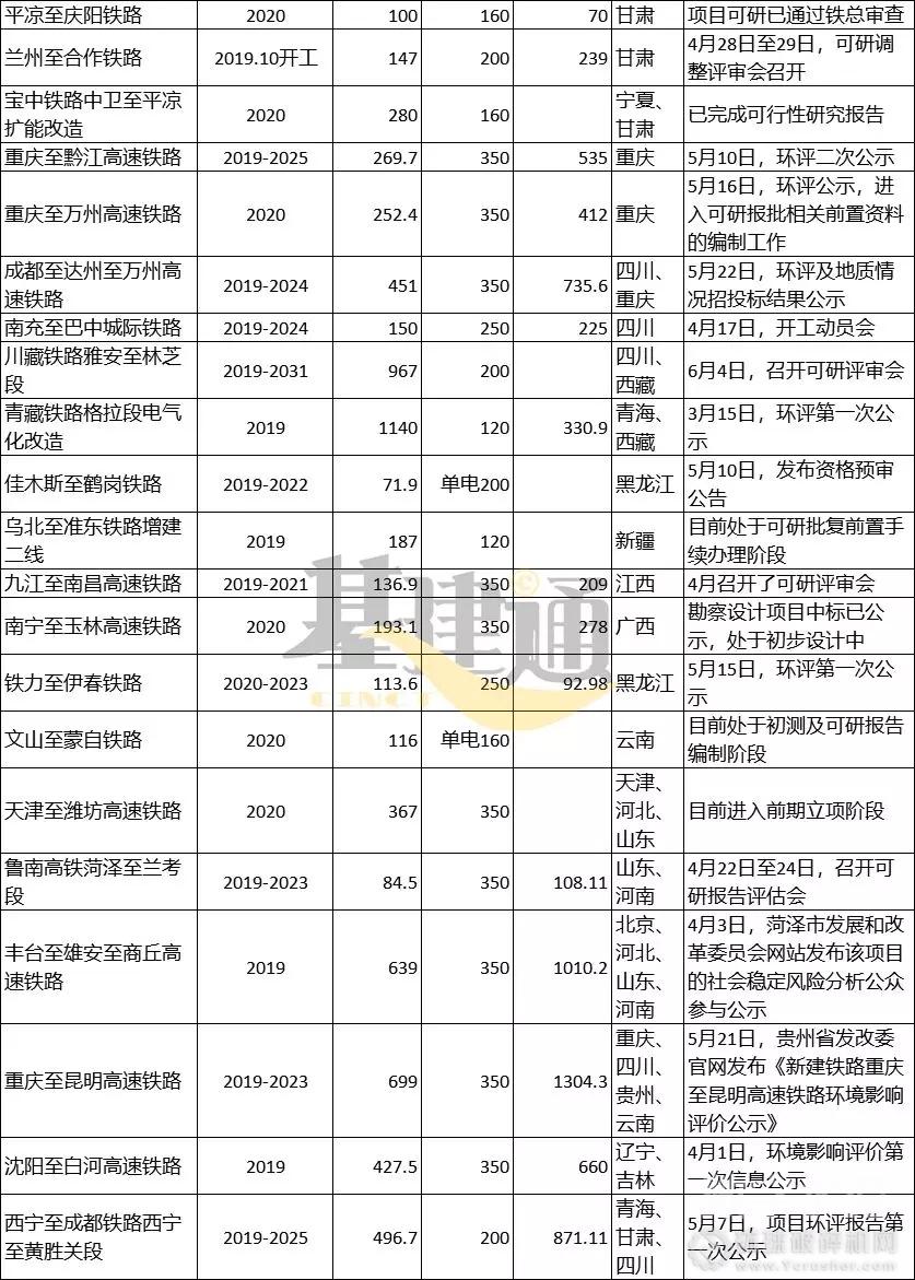 根據2019年鐵路總公司鐵路基本建設計劃以及各省、市、自治區鐵路重點建設項目名單,結合“十三五”鐵路規劃,以為各省份已公布的年度重點項目清單,收集、整理并匯總了2020年前(“十三五”規劃期內)擬開工建設的鐵路項目清單,以及其項目概況和進度情況。