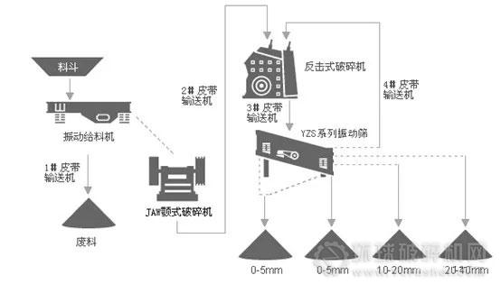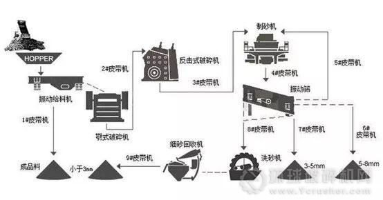 機制砂石生產工藝主要有兩段破碎和三段破碎兩大類,小型機制砂石生產線多采用兩段破碎篩分流程,某些大型機制砂石生產線因物料塊度較大,多采用三段破碎篩分流程,采用四段破碎篩分流程的比較少。