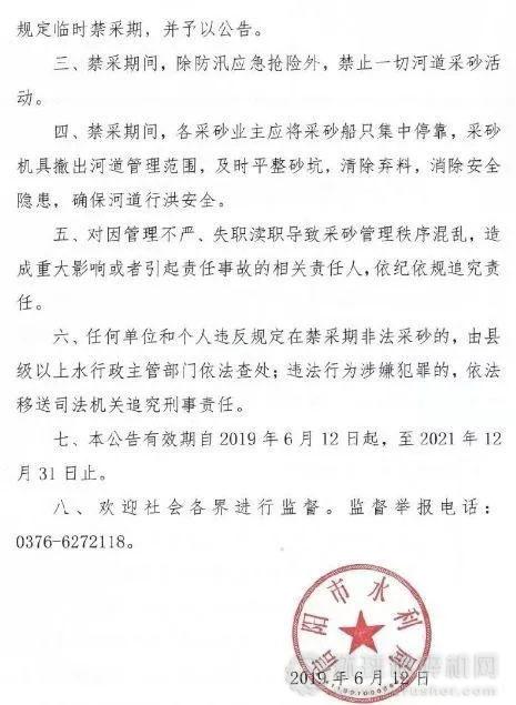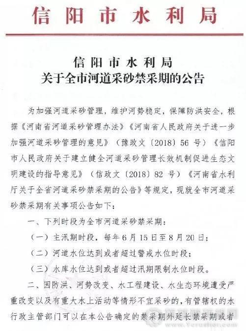 近日,信陽市水利局發布了《關于全市河道采砂禁采期的公告》,每年6月15日至8月20日主汛期時段,為全市河道采砂禁采期。