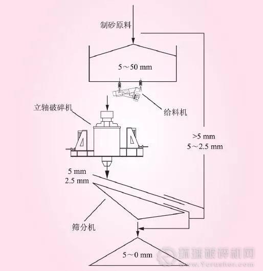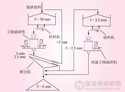石料由轉料倉經給料機、膠帶機送入常(低)速度(v=50~70m/s)的立軸破碎機,破碎后進入篩分機,大于5mm的石料返回轉料倉,5~2.5mm的一部分直接進入成品砂倉,另外一部分石料送入高速度(v>75m/s)的立軸破再破碎,經再破碎的石料與小于2.5mm的石料混合后進入成品倉。其典型流程示意見圖。