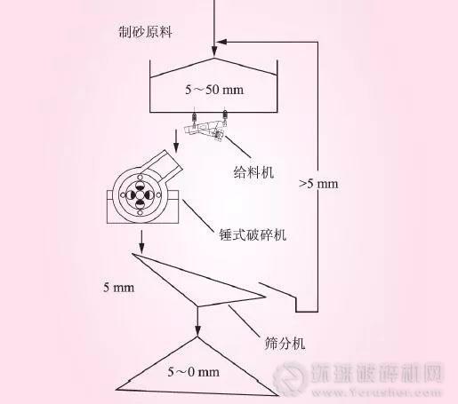 石料由原料倉經給料機、膠帶輸送機送入錘式破碎機,經破碎后送入篩分機分級,大于5mm的石料全部返回轉料倉進行閉路循環,小于5mm的石料進入成品砂倉。其典型工藝流程見圖。