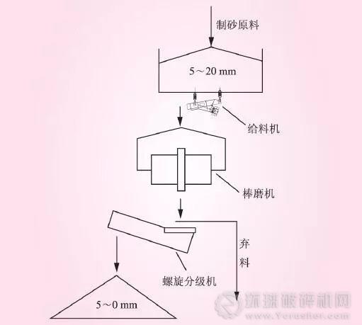 石料由轉料倉經給料機、膠帶機分別送入立軸破和棒磨機,經破碎后送入篩分機分級,大于5mm的石料全部返回轉料倉進行循環,棒磨機粉磨后的物料進入洗砂機洗砂、選砂,再經過脫水篩脫水,小于2.5mm的物料與立軸破的小于5mm的粗砂混合進入成品砂倉。其典型工藝流程示意見圖。
