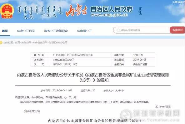 6月3日,內蒙古人民政府發布《內蒙古自治區金屬非金屬礦山企業經理管理規則(試行)》,對大中型金屬非金屬礦山企業經理的聘任條件、權力、義務和責任等內容進行了明確規定。